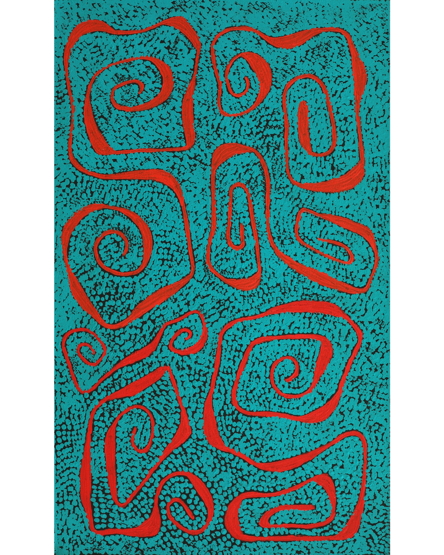 This artwork comes from Warlukurlangu Artists in Yuendumu. The art centre represents Warlpiri artists from Yuendumu and Nyirripi, located in the Tanami Desert northwest of Alice Springs. This remote region of red sand and open desert Country is central to the stories and knowledge shared through the paintings.