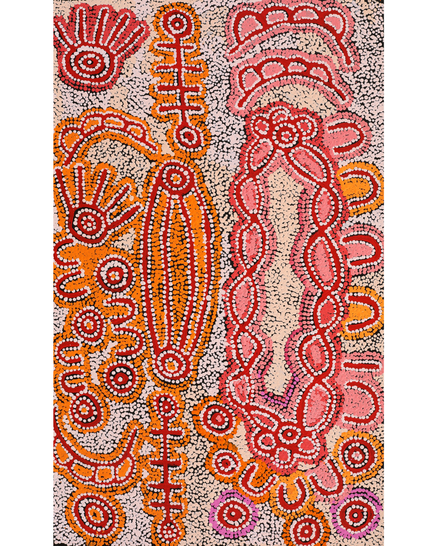 The ‘kirda’ (owners) of this country are Napangardi/Napanangka women and Japangardi/Japanangka men, who can depict portions of the Mina Mina Jukurrpa in their paintings. There are a number of different components of the Mina Mina Jukurrpa; artists usually choose to depict one particular aspect. These can include ‘karnta’ (women), ‘karlangu’ (digging sticks), ‘majardi’ (hairstring skirts/tassels), ‘ngalyipi’ (snakevine [Tinospora smilacina]), ‘jintiparnta’ (desert truffle [Elderia arenivaga]), and ‘kurrkara’ (desert oak [Allocasuarina decaisneana]).