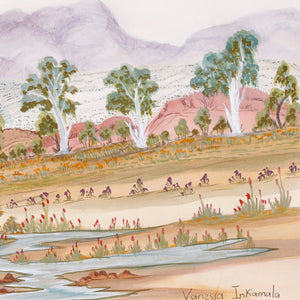 Vanessa currently lives in Alice Springs and paints in the watercolour tradition. She paints the landscape of her ancestors, which is also the country she belongs to.