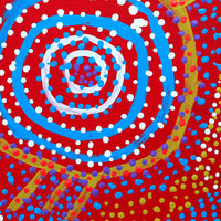 He began painting with Warlukurlangu Artists Aboriginal Corporation, an Aboriginal owned and governed art centre located in Yuendumu and Nyirripi, in 2016. He paints his Mother’s Watiya-warnu Jukurrpa (Seed Dreaming) and his grandfather’s Ngapa Jukurrpa - Puyurru (Water Dreaming), stories passed down to him through the many generations. These stories are creation stories that relate to his family's traditional country, traditions that stretch back for millennia. He uses an unrestricted palette to depict his traditional iconography, at the same time developing a modern individualist style, using bold designs in a variety of contexts. In 2017 he also produced a small number of prints.