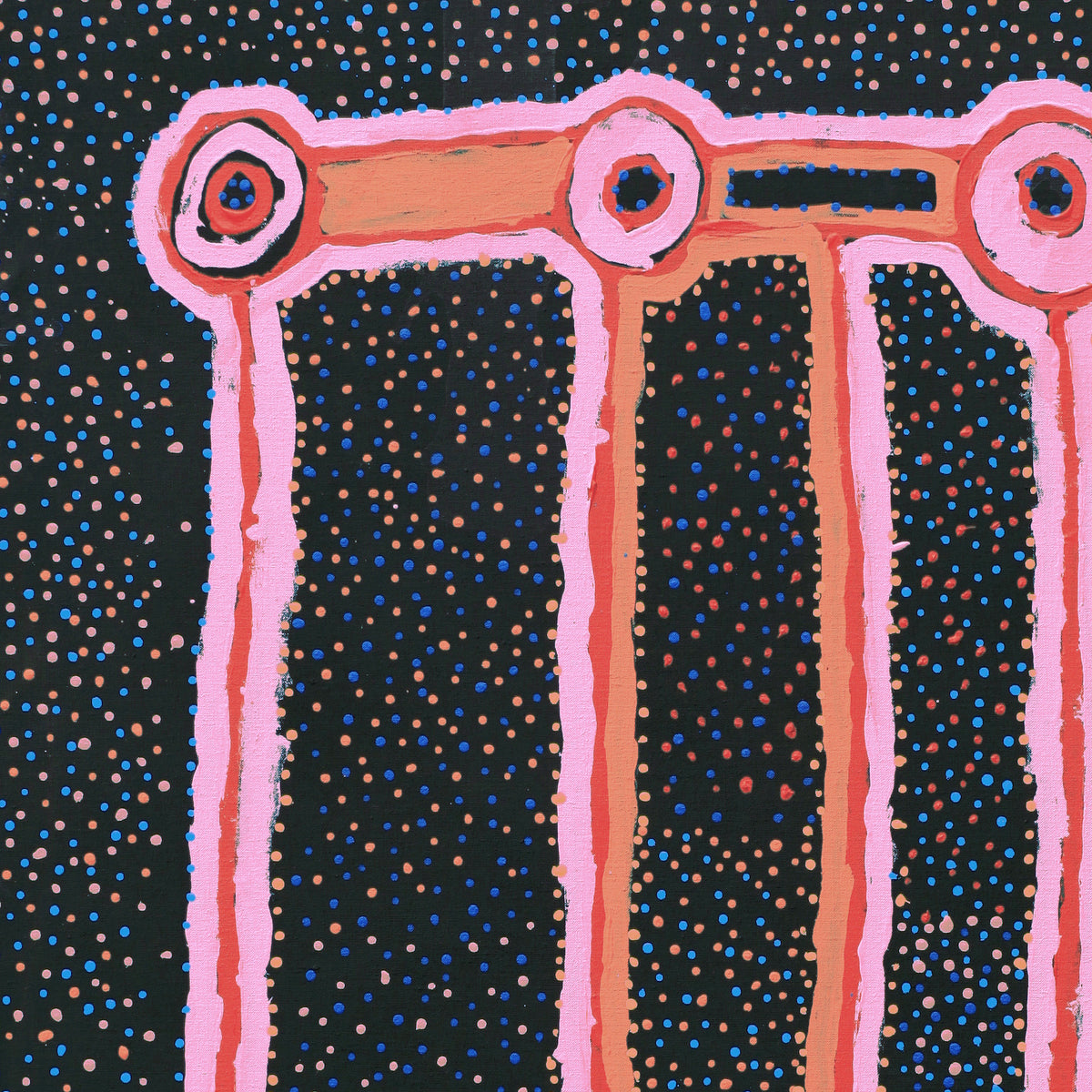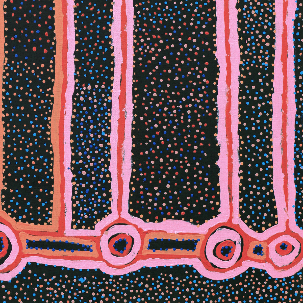 The site depicted in this painting is Puyurru, west of Yuendumu. In the usually dry creek beds are ‘mulju’ (soakages), or naturally occurring wells. The 'kirda' (owners) for this site are Nangala/Nampijinpa women and Jangala/Jampijinpa men. Two Jangala men, rainmakers, sang the rain, unleashing a giant storm. The storm travelled across the country from the east to the west, initially travelling with a ‘pamapardu Jukurrpa’ (termite Dreaming) from Warntungurru to Warlura, a waterhole 8 miles east of Yuendumu. At Warlura, a gecko called Yumariyumari blew the storm on to Lapurrukurra and Wilpiri. Bolts of lightning shot out at Wirnpa (also called Mardinymardinypa) and at Kanaralji. At this point the Dreaming track also includes the ‘kurdukurdu mangkurdu Jukurrpa’ (children of the clouds Dreaming). The water Dreaming built hills at Ngamangama using baby clouds and also stuck long pointy clouds into the ground at Jukajuka, where they can still be seen today as rock formations.