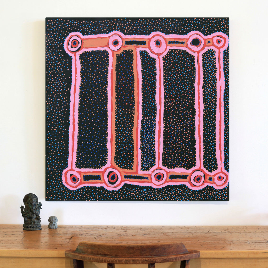 He began painting with Warlukurlangu Artists Aboriginal Corporation, an Aboriginal owned and governed art centre located in Yuendumu and Nyirripi, in 2016. He paints his Mother’s Watiya-warnu Jukurrpa (Seed Dreaming) and his grandfather’s Ngapa Jukurrpa - Puyurru (Water Dreaming), stories passed down to him through the many generations. These stories are creation stories that relate to his family's traditional country, traditions that stretch back for millennia. He uses an unrestricted palette to depict his traditional iconography, at the same time developing a modern individualist style, using bold designs in a variety of contexts. In 2017 he also produced a small number of prints.